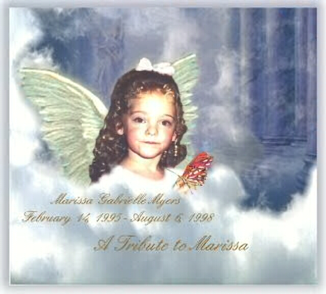 HAPPY 1ST HEAVEN'S DAY Our "TWINKLE STAR" MARISSA GABRIELLE MYERS BORN: FEBRUARY 14, 1995 ENTERED HEAVEN: AUGUST 7, 1998 The Angels are singing this day, in glorious celebration. For on this day they welcomed home God's beautiful creation. We knew you were special from the day you were born. It was clear you were chosen, our hearts to adorn. And your light shone brightly, it warmed every soul. You were ours, precious girl for a short time to hold. Seems like just yesterday you were here with me and then in the next breath, it seems an eternity. For in Heaven, I know it is but a blink of the eye. And only of this world are the tears that I cry. This day for you, Glorious, your life purpose fulfilled we must trust in Jesus and accept God's will. God's peace is what we desire His grace we pray for. For we believe you are waiting just beyond Heaven's door. Not so far from us are you, Marissa, much closer than we know. Today be nearer still, Baby Girl, touch our hearts as we go. Until then, our Twinkle Star, shine bright for us to see. You were not only ours in this life time, but for ETERNITY. WE LOVE YOU AND WE MISS YOU Mommy, Daddy And Baby Matt, Mamaia, Grampsie, Auntie, Uncle Terry, Ryan, Rachel, Nathan, Nanny, Uncle Gary, Jeff, Justin, Joelle, Paran, Uncle Bill and Baby Callie Baby Matt not sure what is going on.